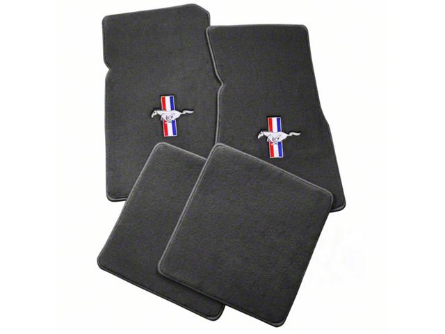 OEM Quality. These gray floor mats are die cut from long lasting cut pile carpet for a perfect fit and finished with a stitched trim for great looks. The Running Pony logo is superbly embroidered on the front two mats for impressive styling.