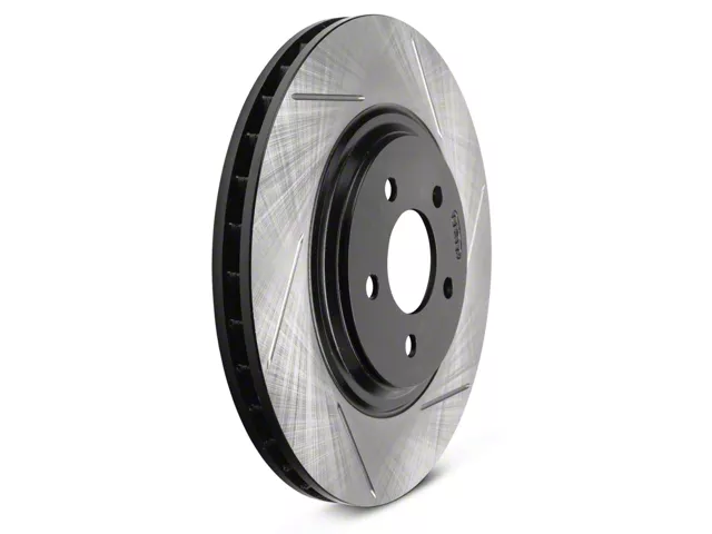 Vented Cast Iron. Made in America, the StopTech Slotted Rotors are 1-piece fully vented rotors with curved, directional right-hand and left-hand vanes. The material used in their construction is cast iron, with an added dose of carbon to boost their tensile properties. The surface features exactly cut slots to refresh both the pads and the surface of the rotors. The components feature black e-coating on the hats, vents, and edges to forestall rust.