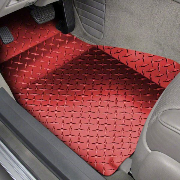 Gives Vehicle Interior Stylish Look. Spruce up the interior of your Ford Mustang with the ACC Diamond Plate Front Floor Mats – Red. With a mirror-like polished finish coming from its aluminum manufacture, these mats go in the front to provide a floorboard covering superior to the factory floor mats.