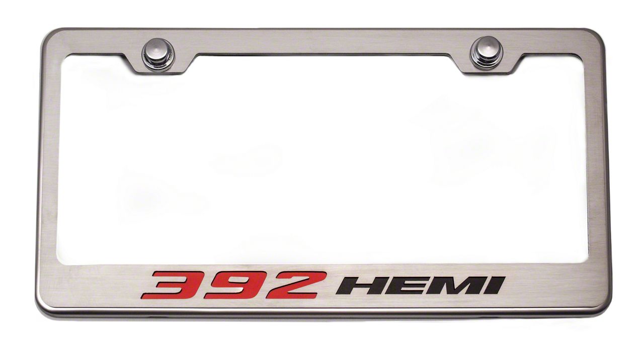 Great Exterior Upgrade. This ACC License Plate Frame with 392 HEMI Logo lets you add a unique accent to your Dodge Challenger’s rear stock license plate. With its design and brushed silver finish, this tag frame will perfectly complement the sleek appearance of your vehicle. The frame features an inlay that combines red and black, which looks great on any exterior finish.