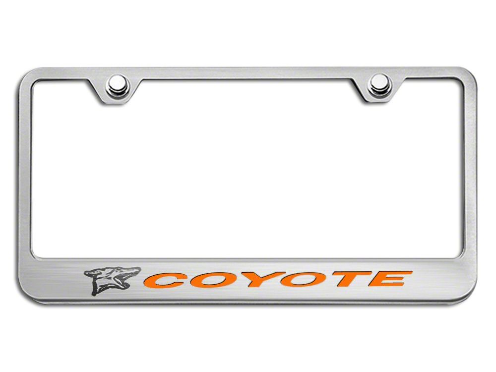 Customize Your License Plate Style. Don’t let a stock license plate frame dull the overall exterior appeal of your Ford Mustang. This ACC License Plate Frame is all you need for an excellent, customized rear license plate style upgrade. It features an image of a coyote’s head on the panel, with matching lettering and an orange fury inlay color. Combined with the polished finish of the frame, you’ll get an easily upgraded sleek look at the rear of your Mustang where your old license plate used to reside.