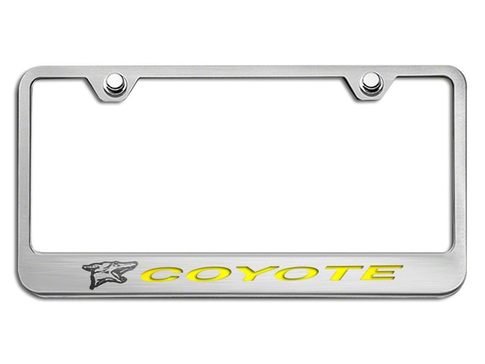 Great Rear Exterior Upgrade. Turn heads with this ACC License Plate Frame with the Coyote Logo in Solid Green Inlay. Coordinate the colors of your Ford Mustang's exterior by adding this frame to your license plate. The frame is custom-designed with a Coyote head and Coyote lettering with green inlay. Combined with a polished finish, this custom frame will add a sleek and unique style to your Mustang.