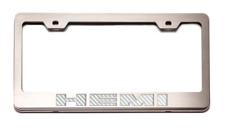 Praise-Worthy Style Upgrade. Get admiring looks and heads turning for your Dodge Challenger by getting an inexpensive but stylish upgrade. This ACC License Plate Frame with HEMI Logo is a cost-effective accessory for your old and boring stock license plate. It features a brushed silver finish with a custom logo, as well as a vinyl or carbon fiber color inlay. The precise trim and clean finish will give your Challenger a sleek exterior style and additional appeal.