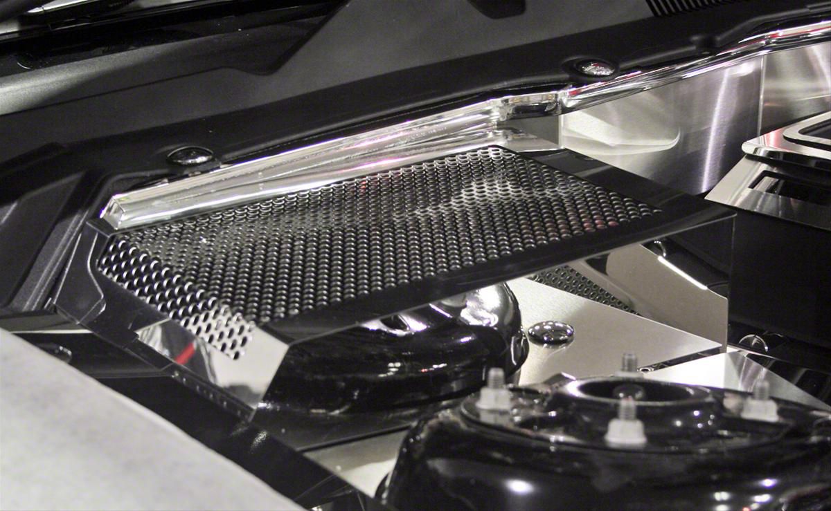 Underhood Style. This Perforated Battery Cover; Polished is a spectacular way to dress up the engine bay of your Mustang. Designed to fit over the stock battery, this cover adds a stylish look to an overlooked part of your machine.