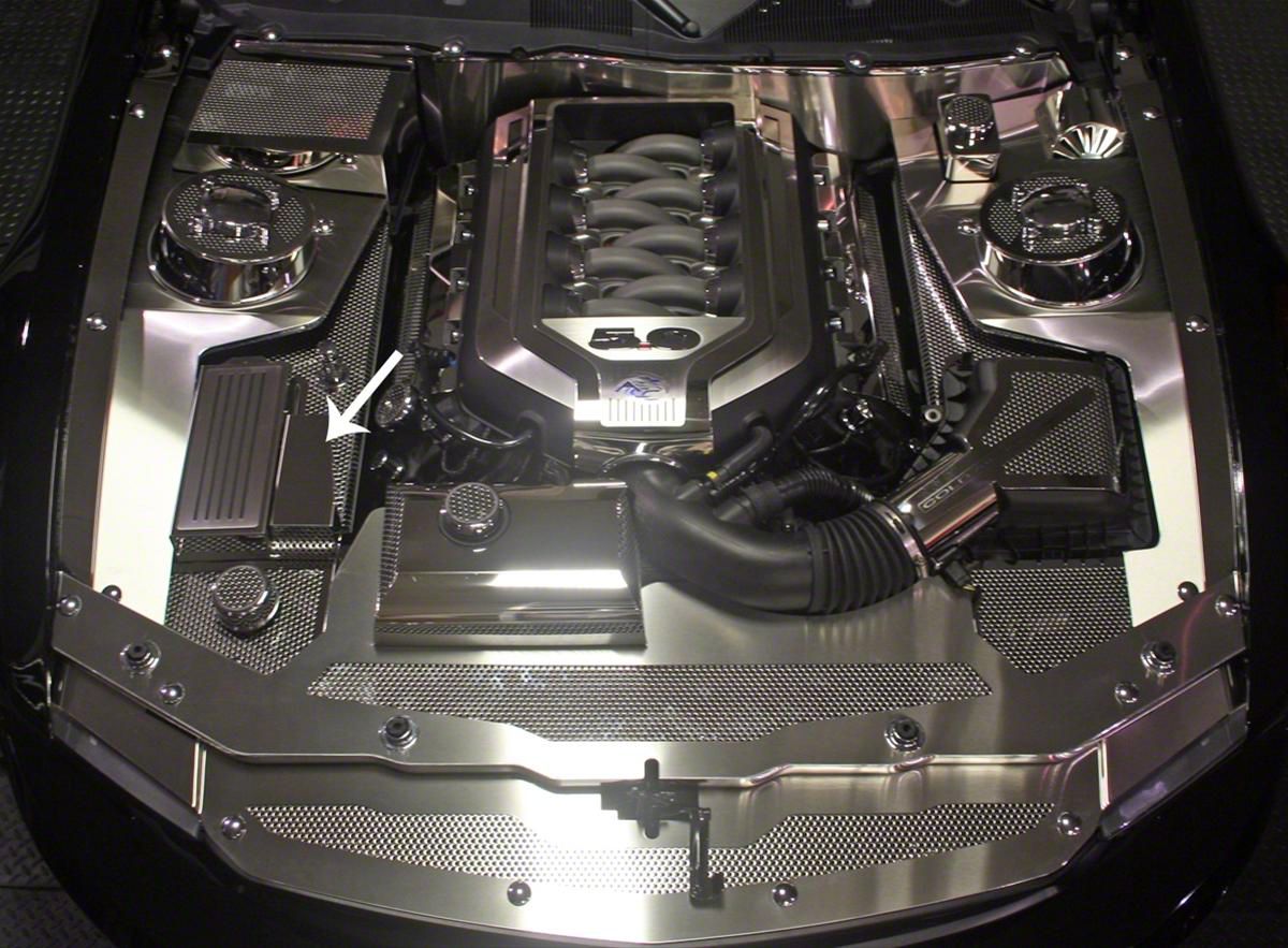Underhood Style. This Perforated BCM Cover; Polished is a spectacular way to dress up the engine bay of your Mustang. Designed to fit over the stock Battery Control Module, this cover adds a stylish look to an overlooked part of your machine.