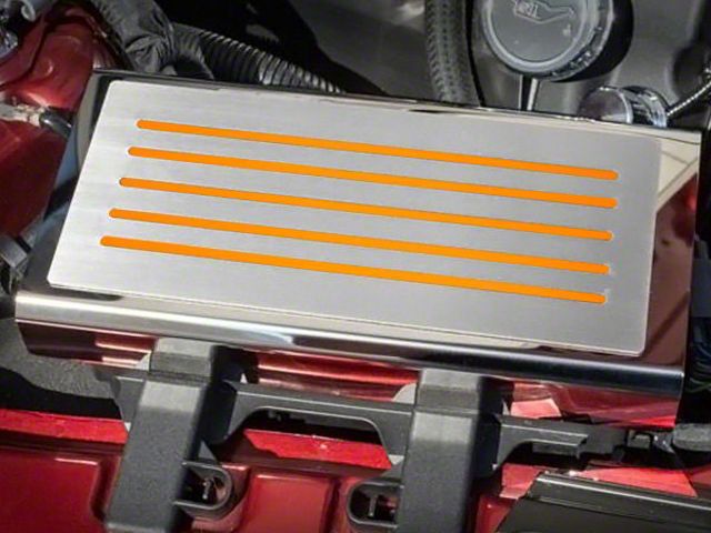 Application. This ACC Polished/Brushed Fuse Box Cover with Orange Fury Inlay is designed to fit all 2015-2023 Ford Mustang models.