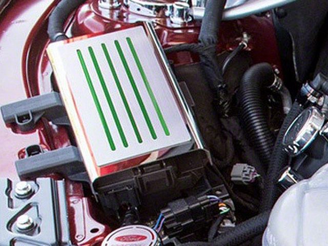 Great Engine Bay Upgrade. A green color-themed engine bay for your Ford Mustang will definitely turn heads during shows or even when you’re just showing off to friends. Complete your upgrade with this ACC Polished/Brushed Fuse Box Cover with Solid Green Inlay. Custom-designed and hand-crafted with a unique style, this cover will add a uniform style to your engine bay. Its main function is to hide the imperfections of having an unsightly fuse box plate which it can do with its brushed slotted finish, mirror-like polished trim, and custom inlay.