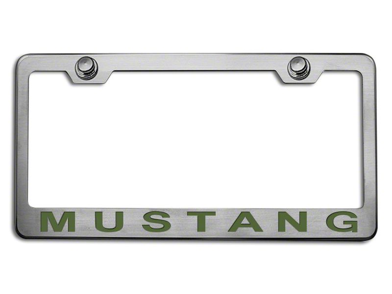 Custom Style. Getting rid of the plain, factory look on your Ford Mustang’s rear license plate is easy. The this ACC Polished/Brushed License Plate Frame with Bullet Green 2005 Style Mustang Lettering is the most cost-effective and simple way of dressing up your Mustang. It features an elegant polished/brushed finish that makes it a stylish background for your vehicle’s plates. The custom style is completed by the 2005-style Mustang text with a bullet green colored inlay.