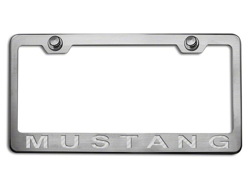 Unique Upgrade. Trick out your Mustang with the ACC Polished/Brushed License Plate Frame with a White Carbon Fiber 2005 style Mustang lettering. This license plate frame spells out "MUSTANG" with inlaid letters. It reinforces the Mustang branding and gives your license plate a suitably stylish frame.