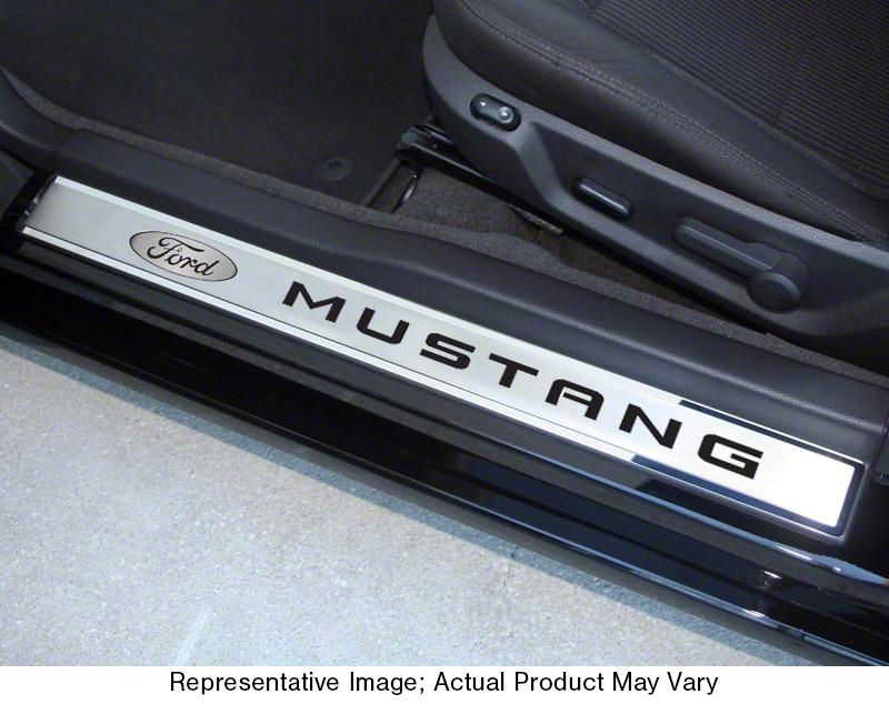 Ford Mustang Door Sill Covers by American Car Craft. Celebrate one of the most iconic muscle car brands in the business with the ACC Polished/Brushed Stainless Door Sill Covers w/ Ford Oval & Mustang Lettering Inlays - Solid Green. In a striking solid green finish, this trim piece comes designed with a Ford oval logo and a Mustang lettering inlay. It is a Ford licensed product, designed for 2010-2014 Ford Mustangs.