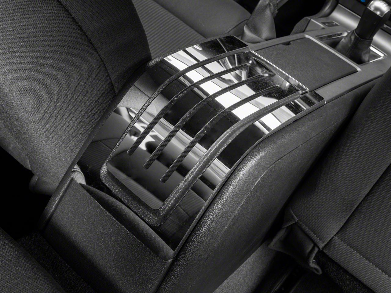 Easy Upgrade. Looking to replace your Mustang's rear center console trim? Then look no further than the Polished Rear Center Console Trim with Carbon Fiber Inlay. This console trim adds a high-end touch and enhances your Mustang’s interior. Race inspired with a slotted design, this custom, classic styling is sure to please.
