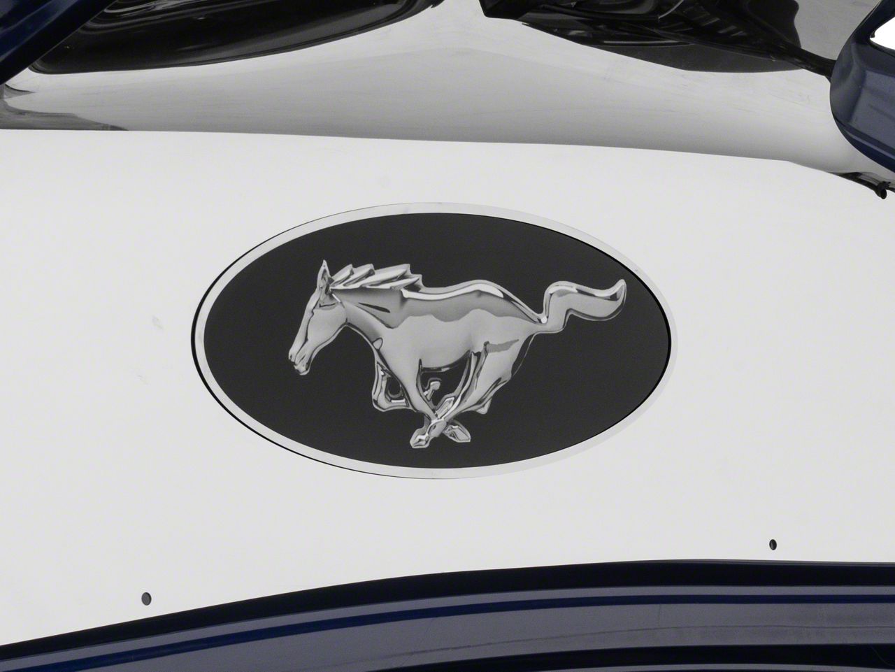 Classy Look. Add a striking touch to your trunk with the Polished Trunk Panel Pony Emblem. This trunk lid graphic features the classic Mustang Pony logo against an eye-catching, mirror-finished background. This unit is designed to mount on the inside of your trunk lid, giving your trunk a classy elegance when opened.