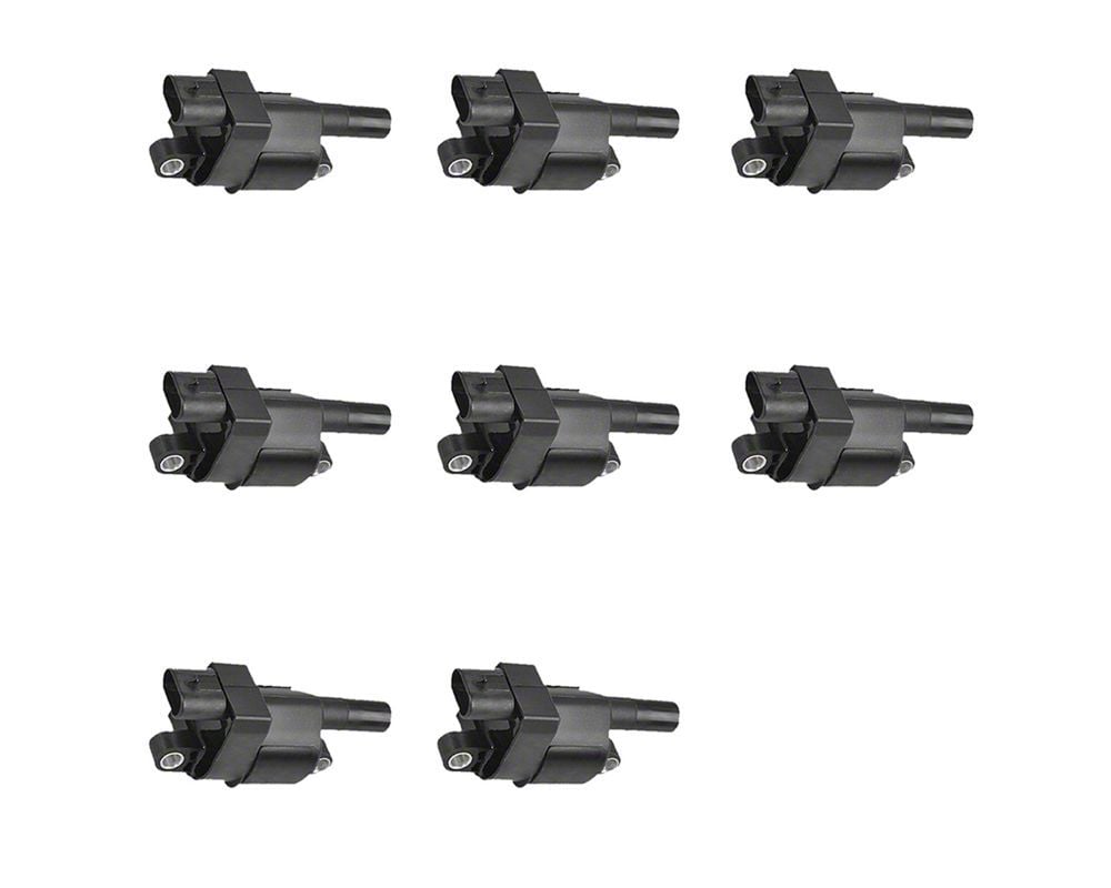Reliable Ignition Coils. This set of eight black ignition coils replaces worn-out stock units, offering dependable, original-quality performance. Ideal for vehicle repair and restoration, these coils deliver optimal voltage to enhance the ignition system, improving start-up times and reducing the chance of misfires or catalytic converter issues.