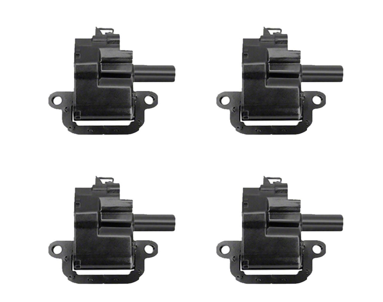 Durable Black Housing. The Ignition Coils; Black; Set of Four are built with a sturdy black housing that resists heat, vibration, and wear inside the engine bay. This durable design ensures long-term reliability, even under demanding driving conditions or extended high-performance use.