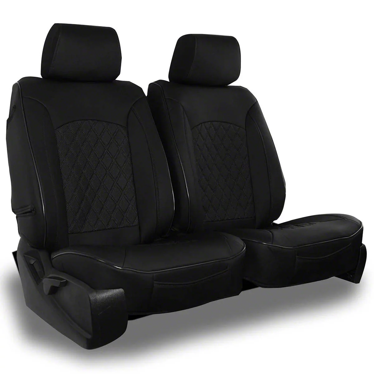 Construction and Appearance. These seat covers are made from high-quality leatherette material, providing a luxurious 3D diamond design with black piping for an elegant finish. The covers also feature Velcro openings to accommodate airbag deployment.