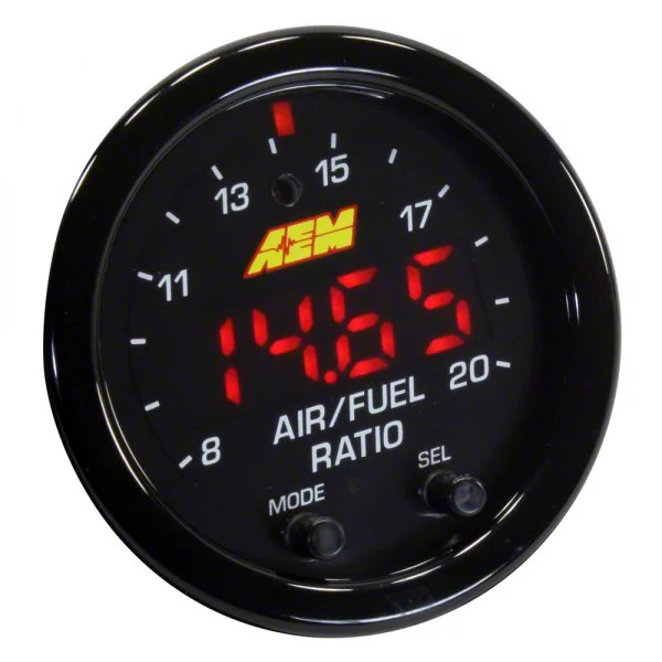 Sleek Black Face. This innovative gauge features a round shape with a sleek black face color and matching black bezel, elevating your dashboard's aesthetics. With a digital gauge style and a broad 8.0:1-20:1 air/fuel ratio range, it offers precise monitoring for a finely tuned drive.