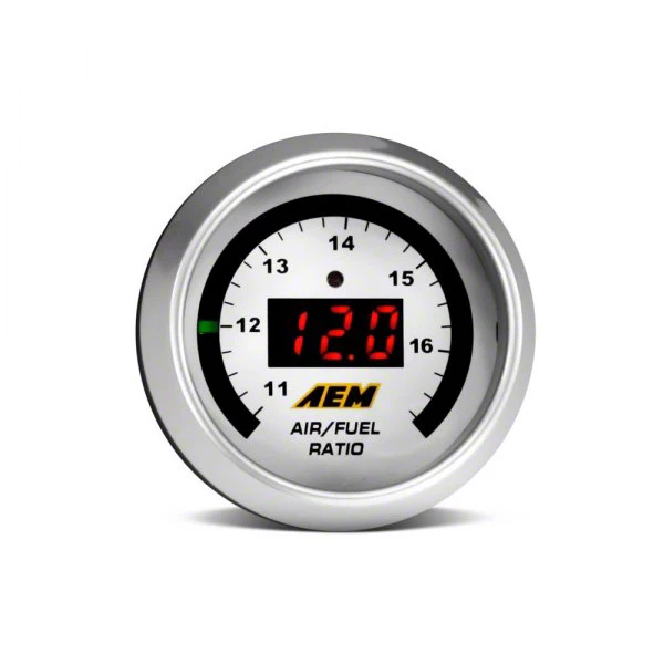 Packed With Features. Made to be one of the most accurate widebands available, the AEM Electronics Digital Wideband UEGO Air Fuel Ratio Gauge controls features a digital LED data display and sweeping needle that changes colors as the air-fuel ratio changes from rich to lean. The 2-1/16" (52mm) diameter contains interchangeable black and white faceplates are surrounded by black and silver bezels for a customized appearance.