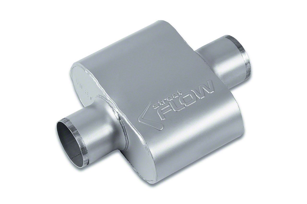 Description. Street-Series Street Flow Mufflers provide that deep, classic exhaust note everyone desires. These mufflers feature a quality aluminized construction and come in a one, two, or three-chamber design that perfectly pairs with your sound output needs. Available in various inlet/outlet diameters and configurations and a round casing version.