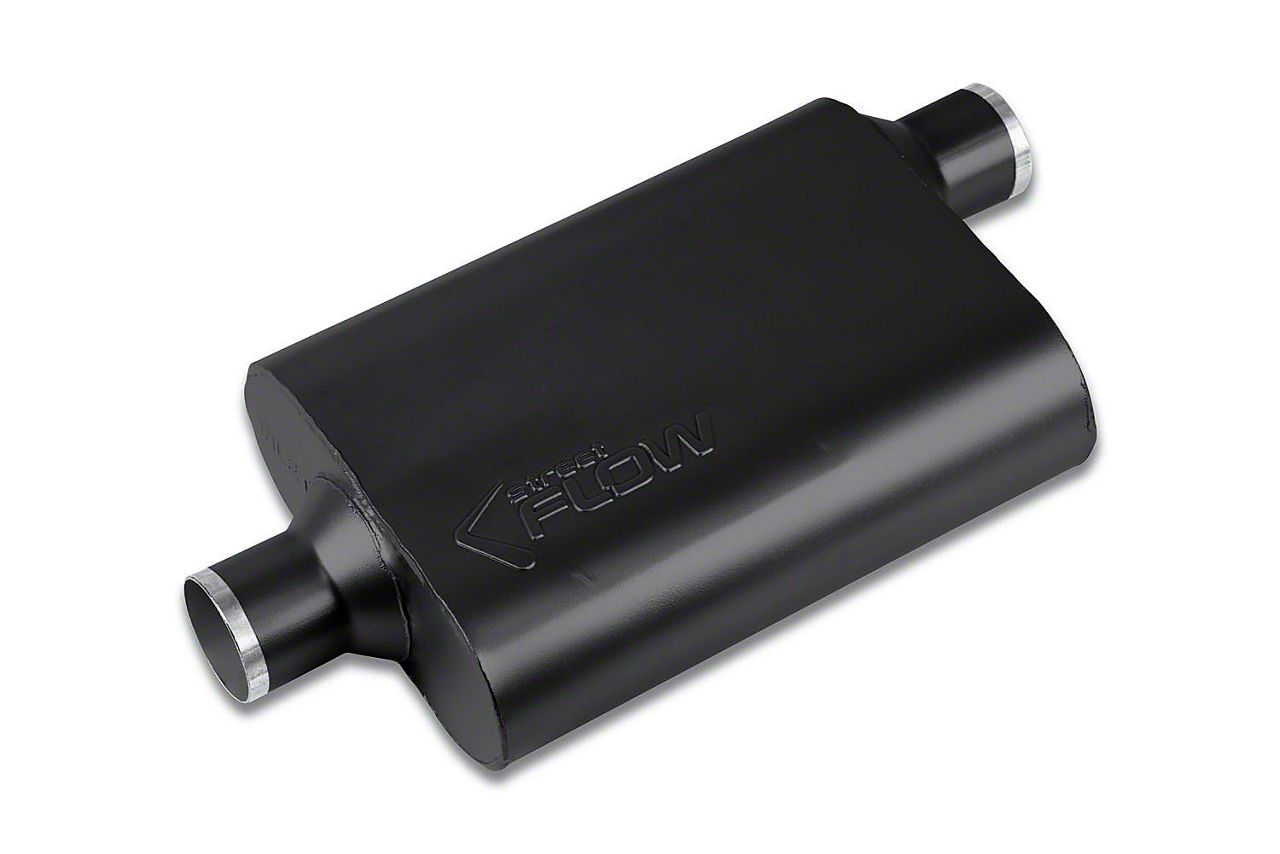 Description. Street-Series Street Flow Mufflers provide that deep, classic exhaust note everyone desires. These mufflers feature a quality aluminized construction and come in a one, two, or three-chamber design that perfectly pairs with your sound output needs. Available in various inlet/outlet diameters and configurations and a round casing version.