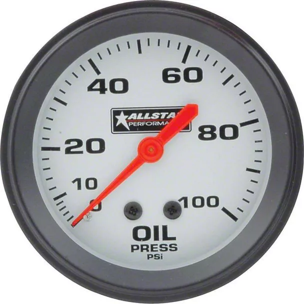 Allstar Performance 2-5/8" mechanical gauges feature a full 270 degree sweeping needle with a silver faced background and a black bezel. Back lit for easy reading even during low light conditions. Perfect for building custom dash panels or when adding mechanical gauges to replace existing gauges or warning lights.