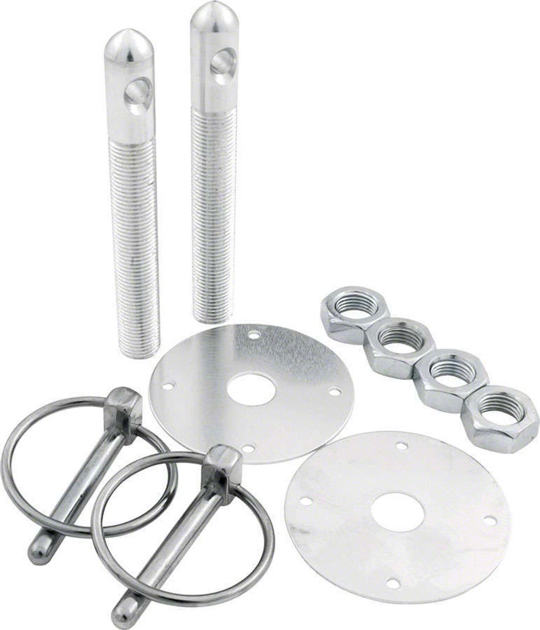 Aluminum Hood Pin Kit. The Allstar Performance Aluminum Hood Pin Kit with 1/2-inch pins in silver is designed to securely fasten vehicle hoods, preventing accidental opening during high-performance use. It is essential for motorsport applications and enthusiasts who need reliable hood retention for safety and durability. This kit ensures ease of use with flip-over steel clips for quick hood removal and installation.