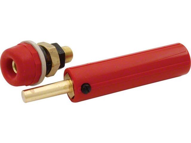 Two-piece, color-coded connectors make safe, out-of-car connection to battery charger quick and easy. Female ends connect to battery cables and pass through a body panel. Male ends of connectors fit on battery charger cables. Shafts are tapered for tight, secure connections.