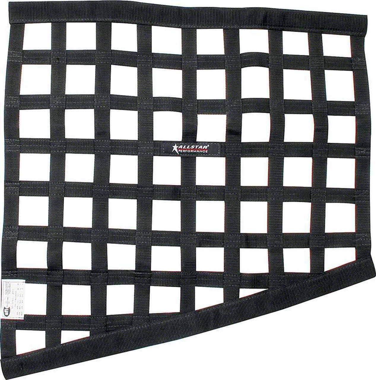Drag window net with border style mounting attaches to the diagonal door bar of most drag cars. Net meets SFI 27.1 specification and is appropriately tagged. Net has top and bottom built-in sleeves to accept most round tube style window net installation kits including ALL10217 and ALL10219.