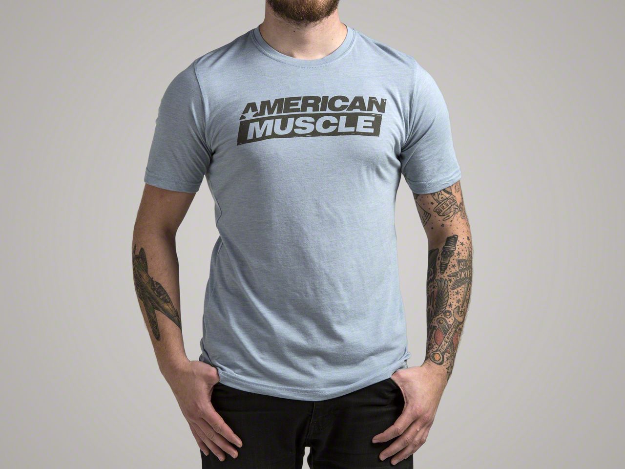 AM Distressed Logo. Being the place to go for all things Mustang, of course some quality apparel would be on the list. Complete with a distressed black AmericanMuscle Logo stretching across the chest, this t-shirt doesn't get any comfier. Whether lounging around the house, doing some yard work, or gearing up for your favorite yearly cruise, you can be sure this simple t-shirt will be a hit.