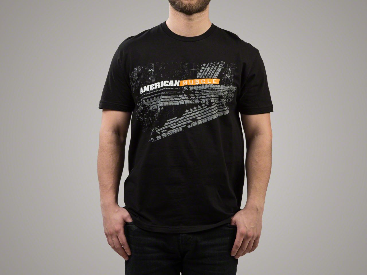 AmericanMuscle Themed Print. This great looking graphic t-shirt features tire tread marks across the chest with the AmericanMuscle logo in white and orange over top. This short sleeve crew shirt is the perfect piece of apparel for shows, track events, or just hanging out with fellow automotive enthusiasts.