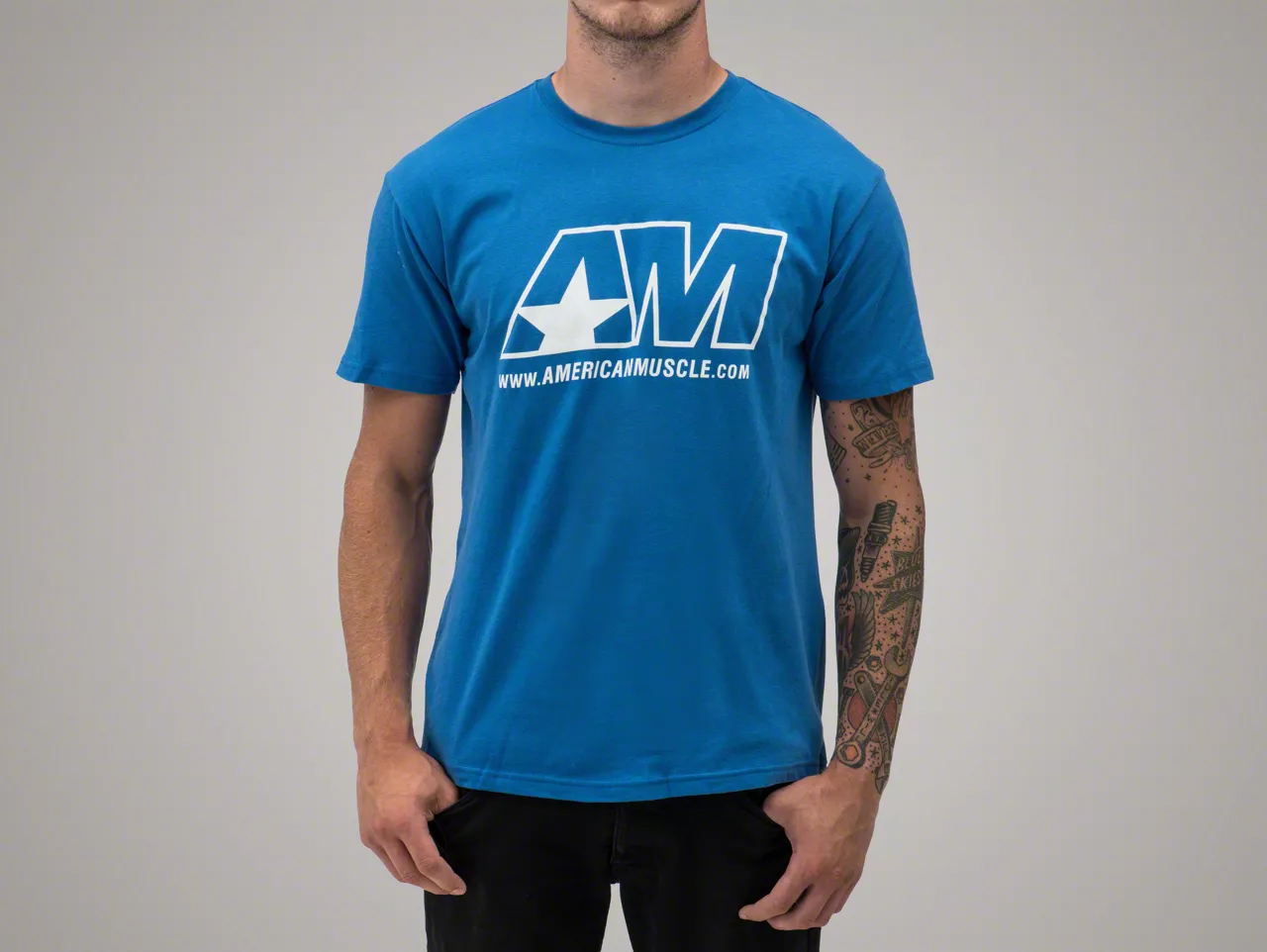 AmericanMuscle Icon. This great looking graphic t-shirt features a large AmericanMuscle Icon logo across the chest with a small AmericanMuscle logo in white on the back. This short sleeve t-shirt is the perfect piece of apparel for shows, track events, or just hanging out with fellow automotive enthusiasts.