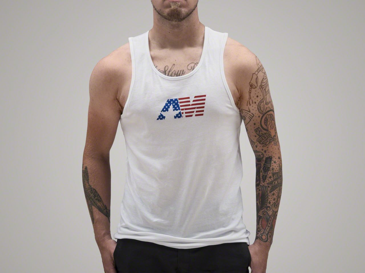 AM Patriot. Show off your "American" muscles with this great looking mens AM Patriot Tank. Perfect for working on your car or working out at the gym, this great looking white Tank features a red, white and blue, stars and stripes design AM logo across the chest and a smaller AmericanMuscle logo on the back.