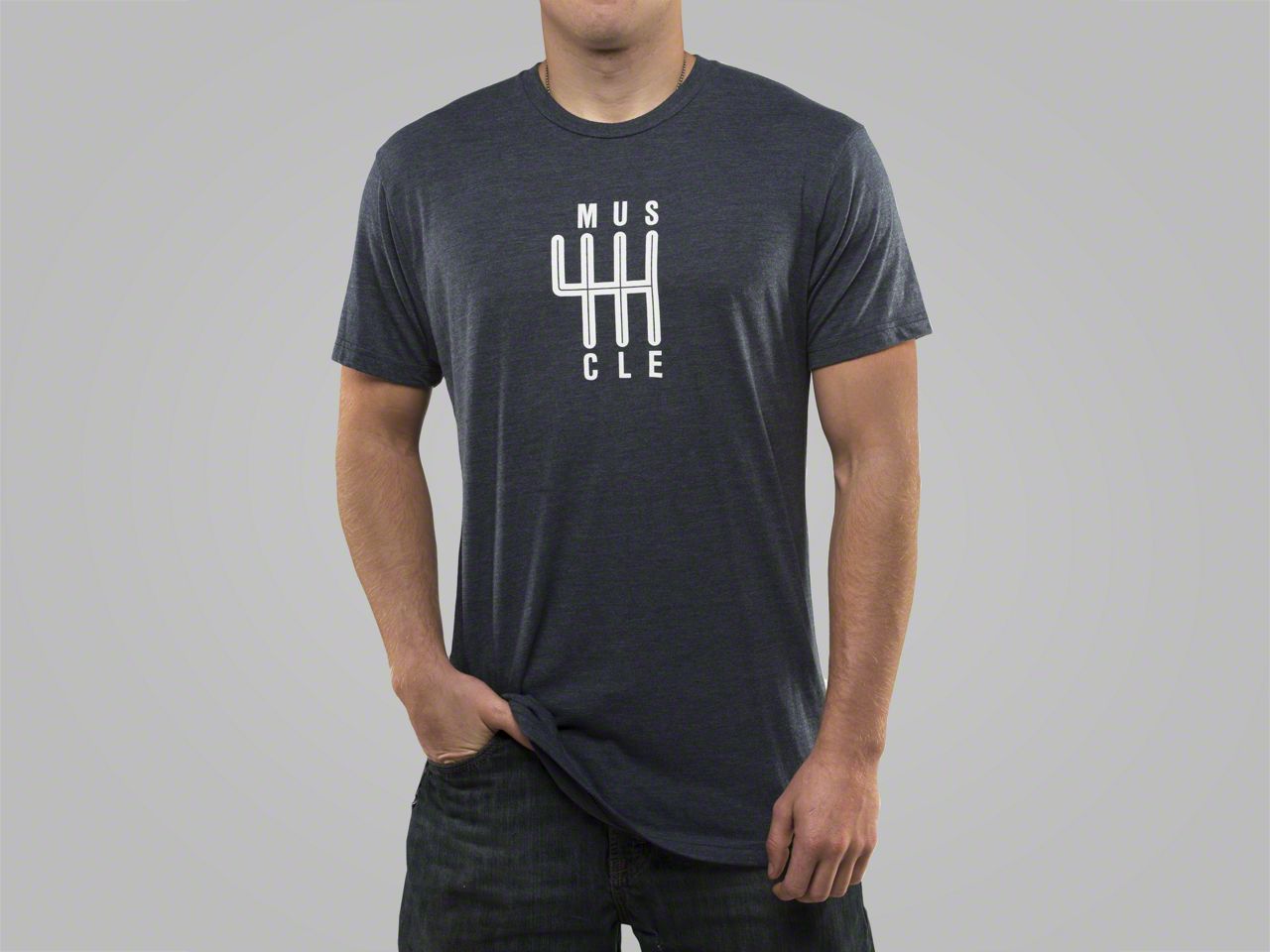 Short Shift Design. This great looking vintage navy AM T-Shirt features a six speed gated shifter graphic in white on the front. The gear select numbers have been replaced with letters to spell out M-U-S-C-L-E. To remove any doubt where your loyalty lies a small AmericanMuscle logo is featured on the back just below the collar. This short sleeve t-shirt is the perfect piece of apparel for shows, track events, or just hanging out with fellow Mustang enthusiasts.