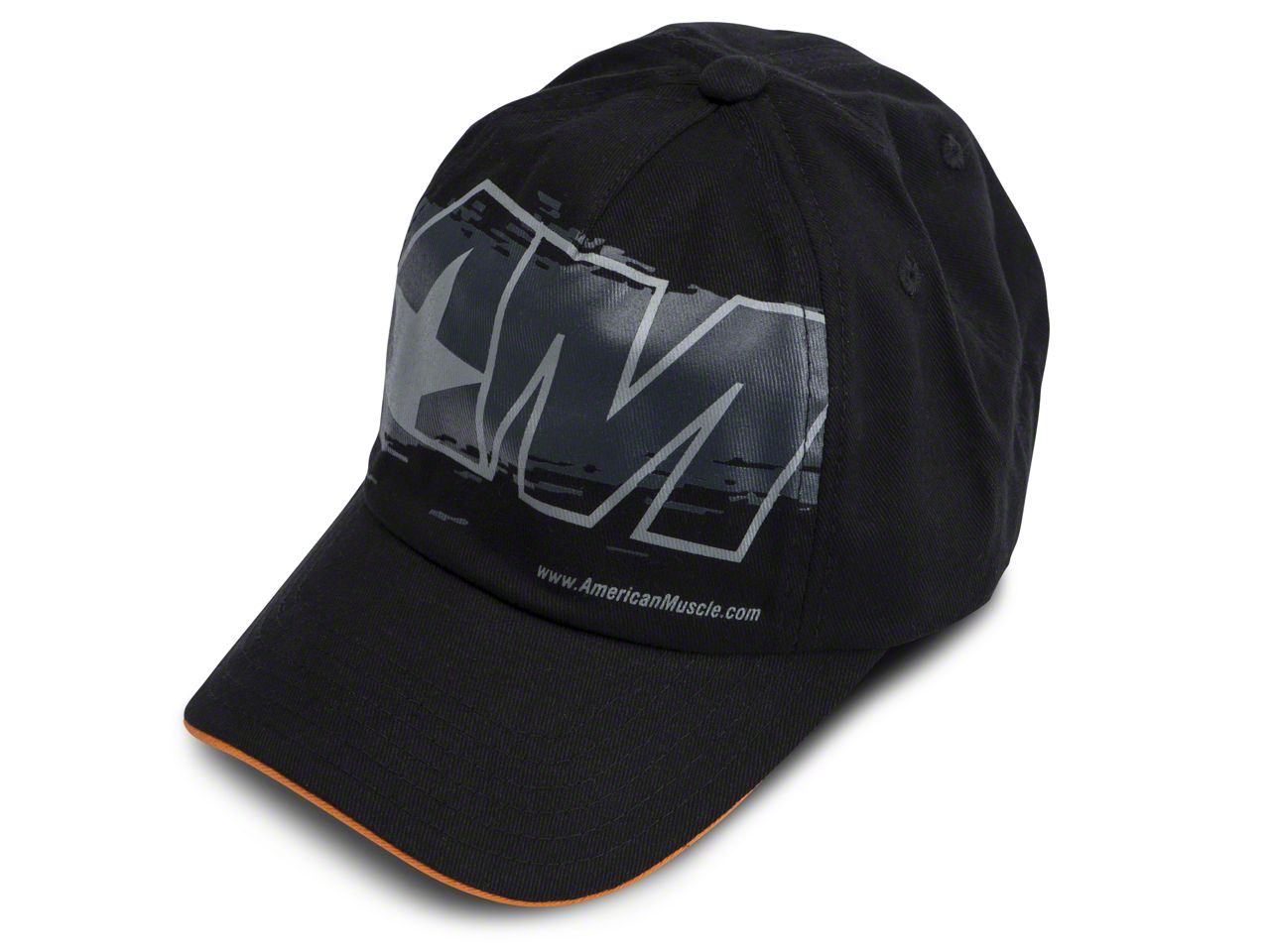 Stylized AmericanMuscle Icon. Show off your enthusiasm for the Mustang with the Shredded Hat from AmericanMuscle. This black hat features a large stylized version of the AmericanMuscle logo in gray across the front, with an orange accent trim around the brim for a stylish appearance. This AmericanMuscle Hat is the perfect piece of apparel for hanging out with your Mustang club at a local car show.
