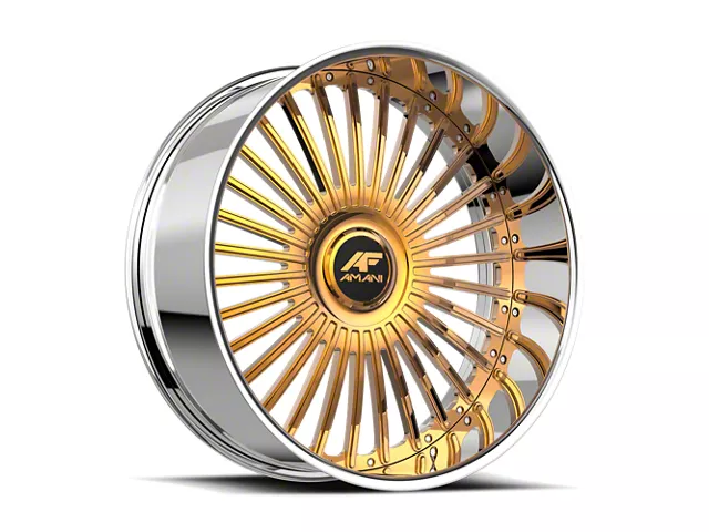 This 26x10 Amani R.E.A.L. 14K Gold Plated Wheel; Rear Only; 26x10; 5mm Offset is completed in a high-quality gold-plated finish to make your wheel the envy of everyone. For added looks and durability, the wheels has a durable clear coat that withstand the rigors of daily driving.