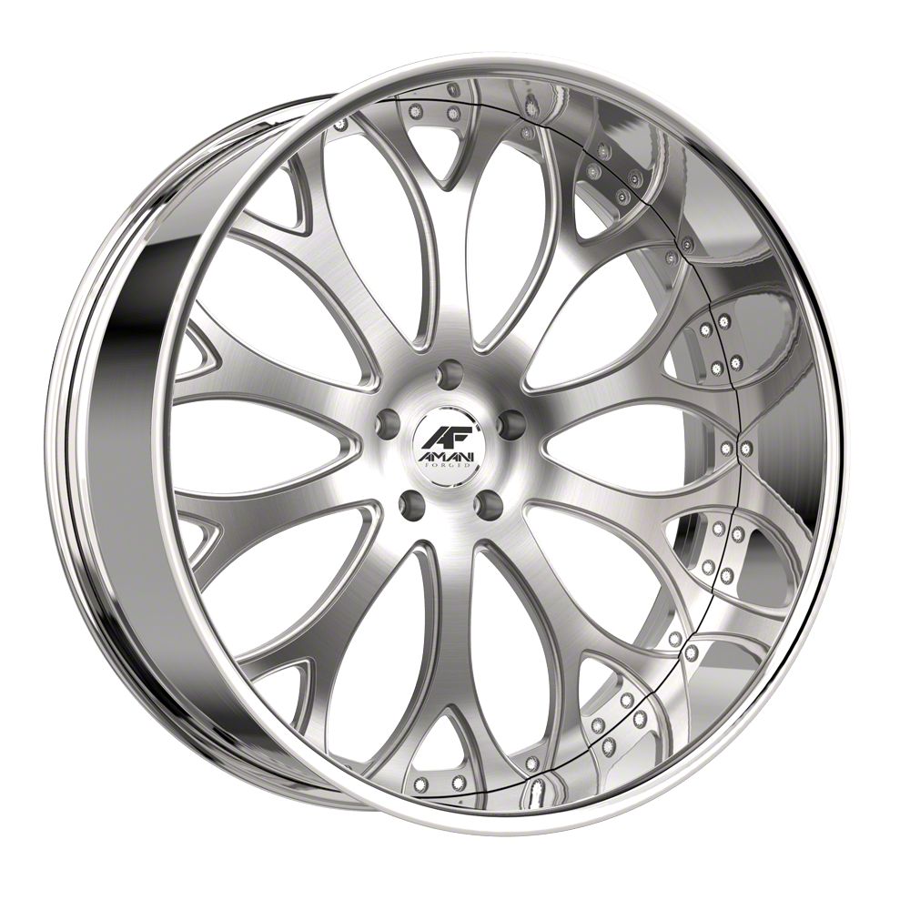 This 24x9 Amani Tango Brush Center with Chrome Lip Wheel; Rear Only; 24x9; 15mm Offset is completed in a high-quality brushed finish with a chrome lip to make your wheel the envy of everyone. For added looks and durability, the wheels has a durable clear coat that withstand the rigors of daily driving.