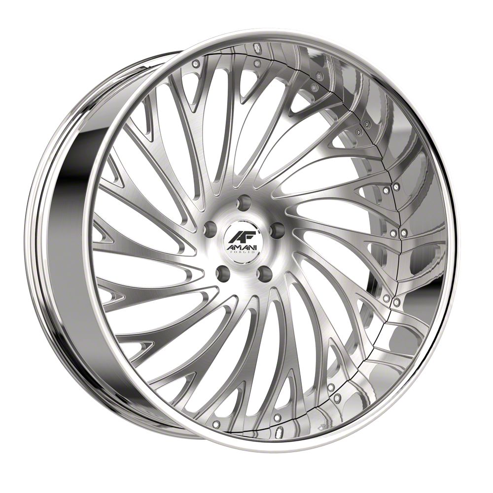 This 22x9 Amani Vamos-R Brush Center with Chrome Lip Wheel; 22x9; 15mm Offset is completed in a high-quality brushed finish with a chrome lip to make your wheel the envy of everyone. For added looks and durability, the wheels has a durable clear coat that withstand the rigors of daily driving.