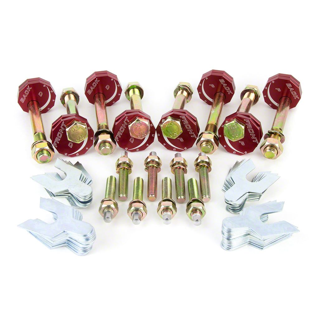 Construction and Appearance. Crafted from premium 6061-T6 aluminum, the components in this camber kit are both lightweight and extremely durable. The metallic red finish adds a bold visual touch while offering resistance to corrosion and wear. Each kit includes upper control arm studs and is manufactured in the USA with high-precision standards to ensure quality and performance.