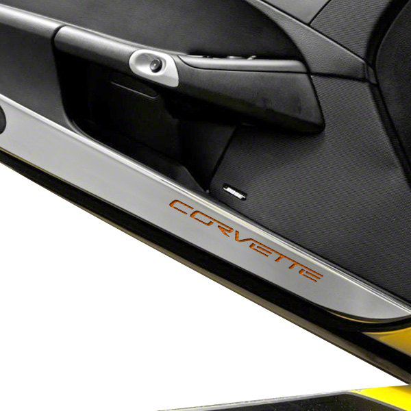 Robust and Resistant. Constructed from full stainless steel, these door guards are not only robust but also resistant to fading, rust, and tarnishing, ensuring they maintain their pristine appearance for years to come. The orange carbon fiber inlay finish adds a unique and sophisticated touch, complementing the Corvette's iconic design while offering an extra layer of customization.