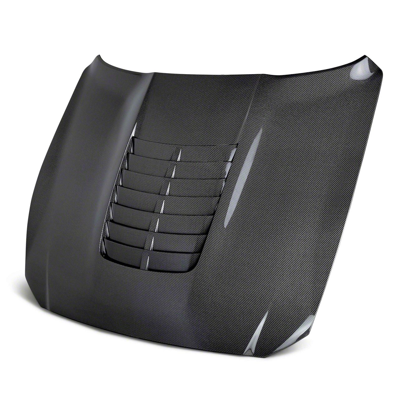 Construction and Appearance. This hood is constructed using premium double sided carbon fiber, ensuring lightweight durability with a high-gloss finish on both the top and underside. Crafted using a vacuum infusion process, it provides structural strength while showcasing a sleek, race-inspired texture. The hood includes integrated heat extractor vents that are both stylish and functional.