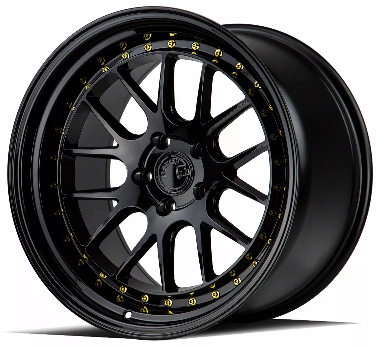 Aodhan DS06 Gloss Black with Gold Rivets Wheel; Rear Only; 19x11; 22mm Offset offers a sleek and assertive aesthetic that enhances a vehicle's visual presence. Its gloss black finish amplifies the appeal, making it a great match for bold styling themes. This wheel brings a refined edge to any build while maintaining a confident stance on the road. Crafted to elevate the appearance of a wide range of vehicles.