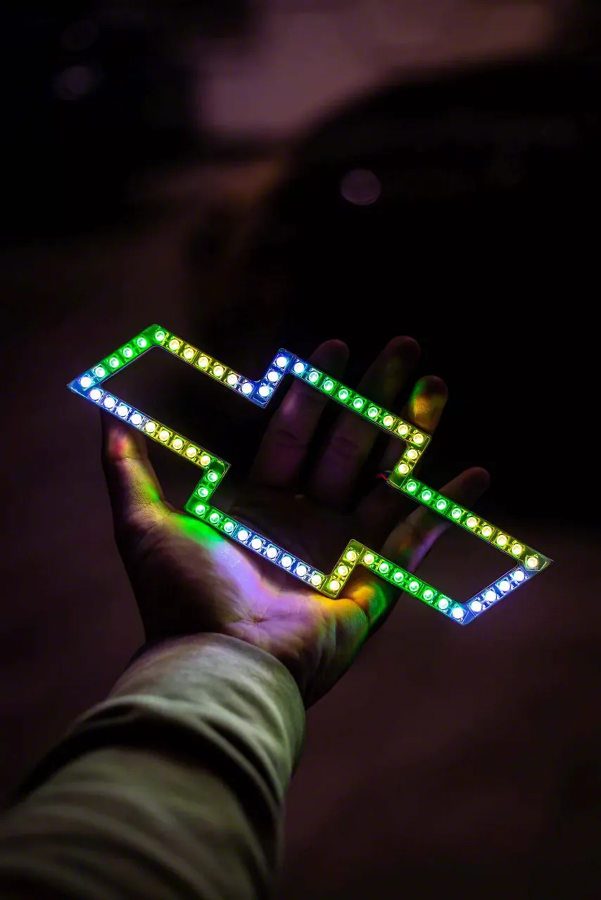 Construction and Features. Built with high-quality LEDs, this flowtie logo delivers bright and vibrant colors that enhance the visual appeal of your vehicle. The dynamic "Chasing Flow" mode creates moving light patterns, offering a unique and striking appearance. The logo features an adhesive backing and wiring for versatile mounting, making it suitable for various locations on your vehicle. The Bluetooth app control allows you to customize the light settings, including colors and effects, to match your style.
