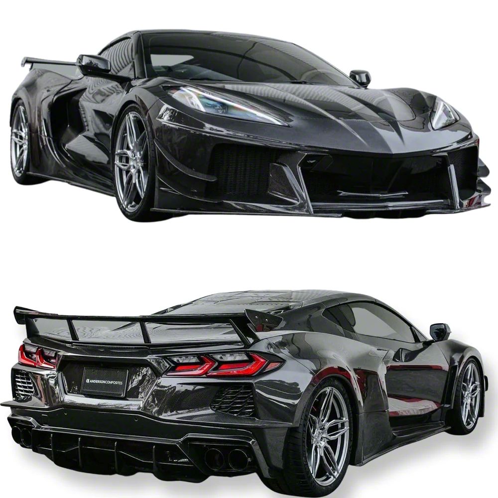 Race-Inspired Widebody Look. Transform your Corvette C8 Stingray Convertible into a head-turning machine with this Auto Addict USA Deluxe Wide Track Package Full Body Kit. Crafted from genuine carbon fiber, this comprehensive kit delivers an aggressive and aerodynamic widebody aesthetic inspired by the legendary Corvette C8.R race car. It adds approximately 1.5 inches of width to each front fender and 1.75 inches to each rear fender, creating a more imposing and performance-oriented stance.