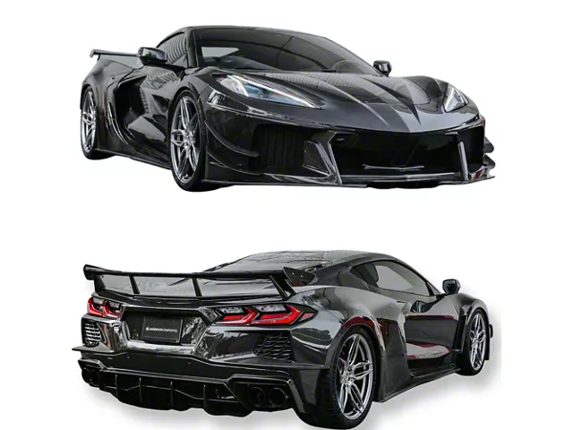 Race-Inspired Widebody Look. Transform your Corvette C8 Stingray Convertible into a head-turning machine with this Auto Addict USA Deluxe Wide Track Package Full Body Kit. Crafted from genuine carbon fiber, this comprehensive kit delivers an aggressive and aerodynamic widebody aesthetic inspired by the legendary Corvette C8.R race car. It adds approximately 1.5 inches of width to each front fender and 1.75 inches to each rear fender, creating a more imposing and performance-oriented stance.