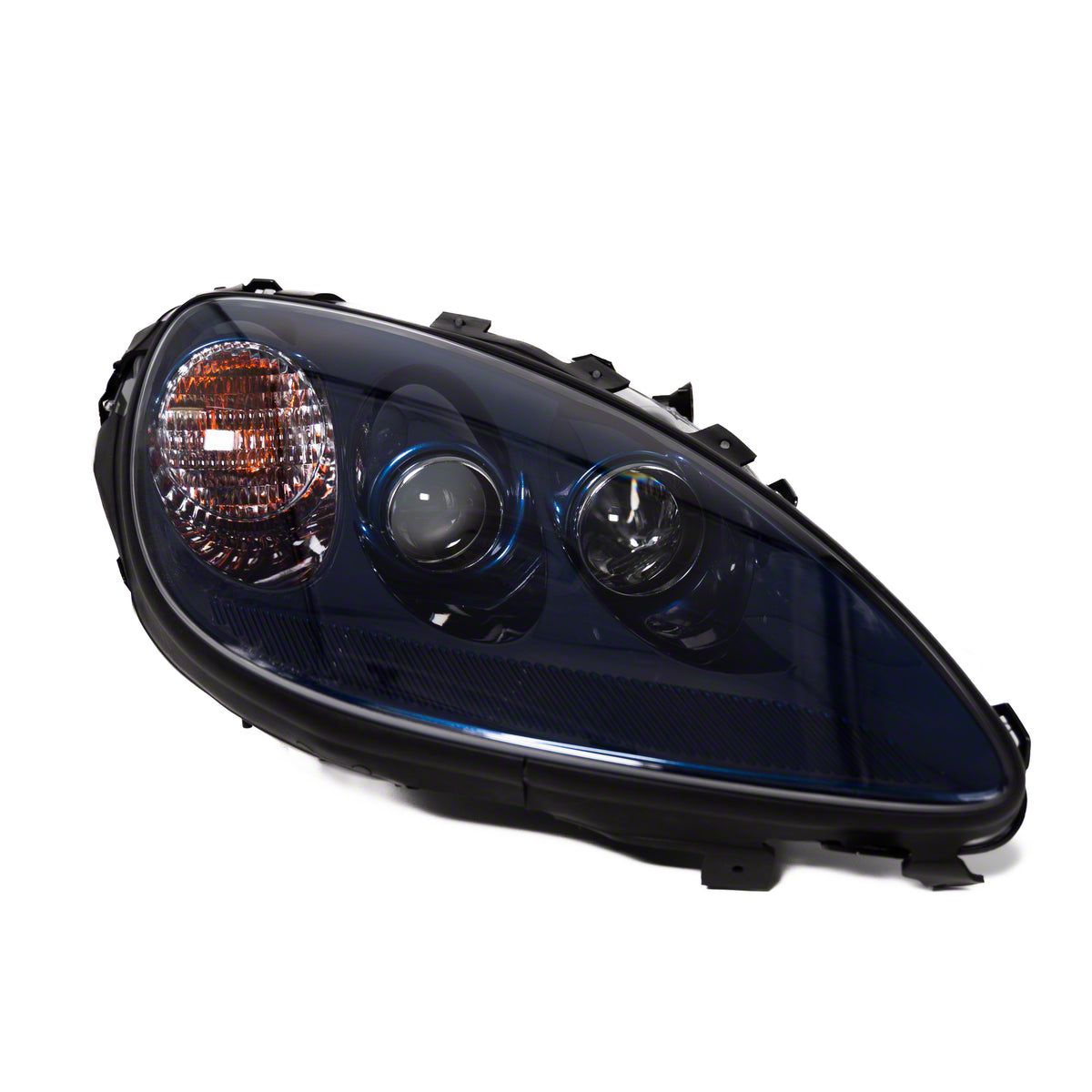 Installation. Remove the OEM headlight by unbolting and unplugging, mount the blue housing headlight in place, install mounting bolts and seals, reconnect the wiring harness, and aim the beam per specification.