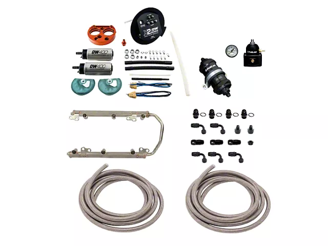 Construction and Appearance. This kit features dual DW400 fuel pumps housed within a DeatschWerks X2 Series fuel pump module, ensuring robust fuel flow. It includes a Fuelab 818 in-line fuel filter and a 515 EFI adjustable fuel pressure regulator, all connected via stainless steel braided hoses and AN fittings. The modified 3.7L V6 fuel rail comes equipped with -8AN stainless steel fittings, providing a sleek and durable setup.