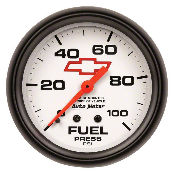 Fuel Pressure Monitoring. The Auto Meter Chevy White Series 2-5/8-Inch Fuel Pressure Gauge; 0-100 PSI; Mechanical provides precise measurement of fuel pressure for both fuel injected and carbureted applications. It helps ensure optimal performance and prevents potential engine failures by accurately showing real-time fuel pressure levels. The gauge's mechanical operation makes it a reliable tool crucial for engine safety and performance tuning.