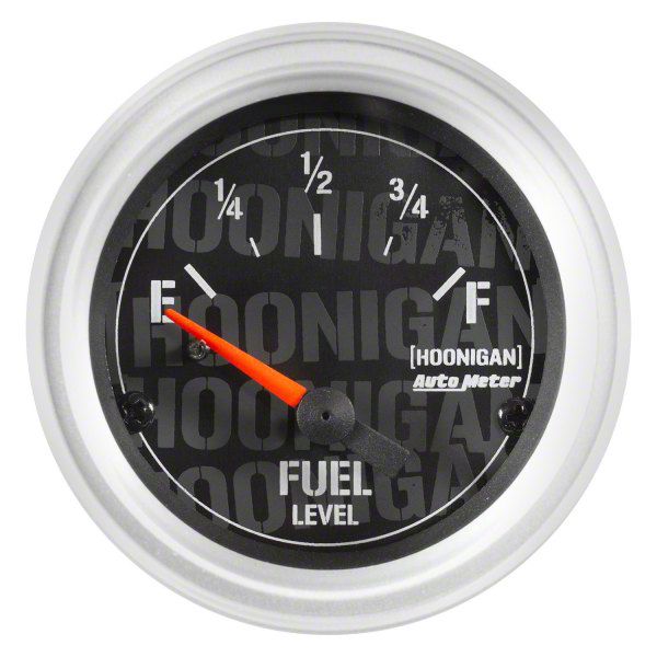 Hoonigan-Inspired Style. Infuse your vehicle's interior with the distinctive and aggressive styling of the Auto Meter Hoonigan Series 2-1/16-Inch Fuel Level Gauge. Featuring bold graphics and a performance-oriented design, this gauge adds a custom, race-inspired touch to your dashboard. Elevate your cockpit's aesthetic and showcase your passion for automotive culture with this unique gauge.