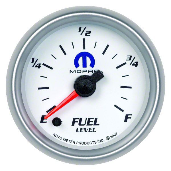 Programmable Fuel Level Gauge. The Auto Meter MOPAR Series 2-1/16-Inch Programmable Fuel Level Gauge; 0 ohm Empty to 280 ohm Full is designed to provide precise and customizable fuel level monitoring. It simplifies installation with multiple preset resistance configurations and a custom calibration mode that adapts to any sender operating within the specified ohm range. This versatility ensures optimal fuel level accuracy across a wide range of vehicles and applications.