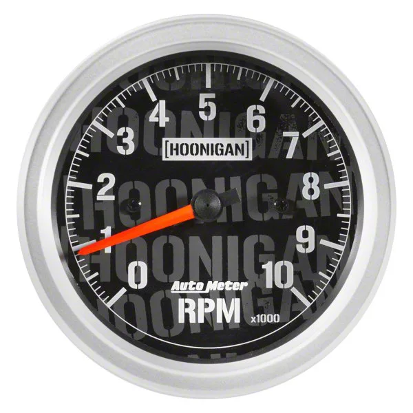 Description. The AutoMeter X Hoonigan gauge collaboration started with Head Hoonigan in Charge, Ken Block's 1965 Ford Mustang Hoonicorn RTR, made famous by the Gymkhana SEVEN installment of his viral video series. A set of bespoke gauges were created for the project , and we are now proud to announce their availability for your own tire slaying creations! Built upon proven AutoMeter Pro-Comp Ultra-Lite internals, these instruments are fitted with unique Hoonigan Industries designed cosmetics which include matte black, Hoonigan 'stamp' dials with stencil font, two color fluorescent red and matte black pointers, and satin silver 'Monster' bezels. The AutoMeter X Hoonigan instrument offering includes standard 2Ó gauges, 3 3/8Ó speedometer and tachometer, as well as a 5Ó in-dash tachometer.