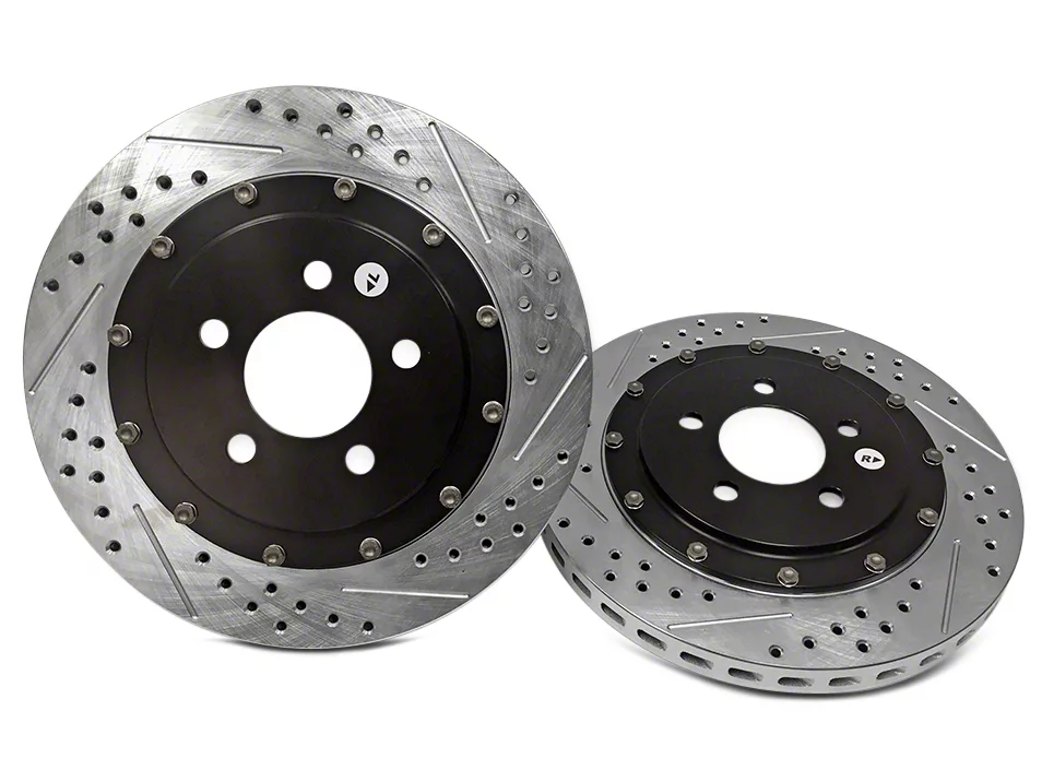Rotors that Give Your Stopping Power Teeth. Boost your stopping power to new heights on your 1994-2004 Cobra-style Mustang (including Bullitts and Mach 1s) with the Baer EradiSpeed+ 2-Piece Drilled and Slotted Rotors, Front Pair, which also cuts stopping distance even in soaking wet situations. The drilling and slots accomplish this by keeping the rotor surface clean and fresh for excellent bite, plus constantly refresh the pads. The two-piece design is also vented and thus cooler, making it nearly invulnerable to fade.